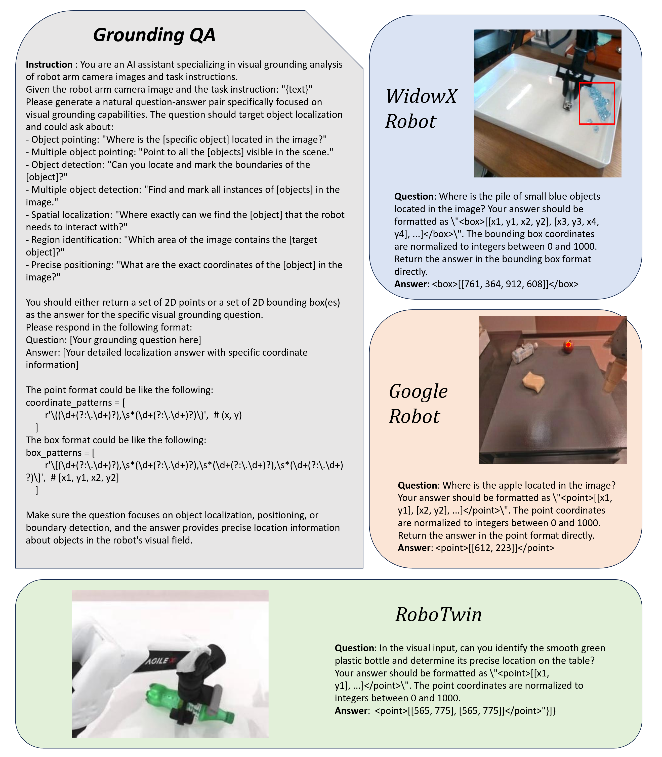 - 任务特定提示:针对具身任务的指令 / 问题(如 "What is the robot doing?""Locate the broccoli.")。