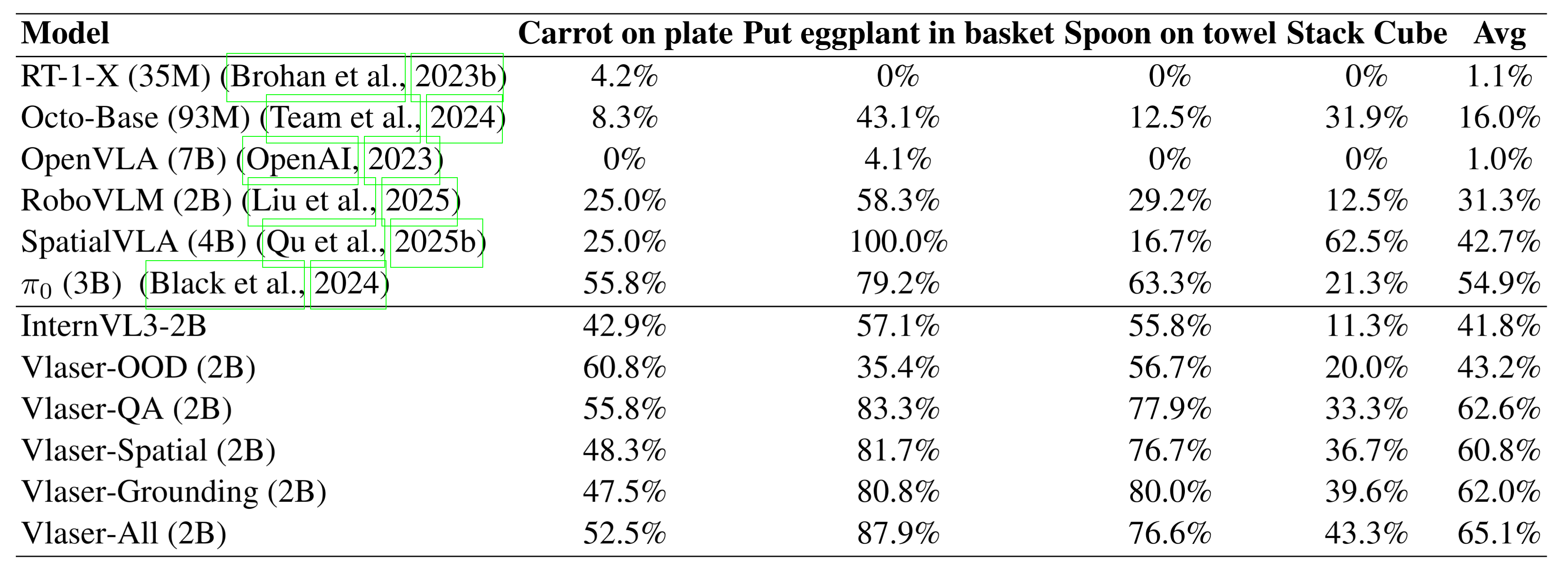 - 训练数据:Vlaser-6M 中的领域内数据(机器人交互场景专属数据)。