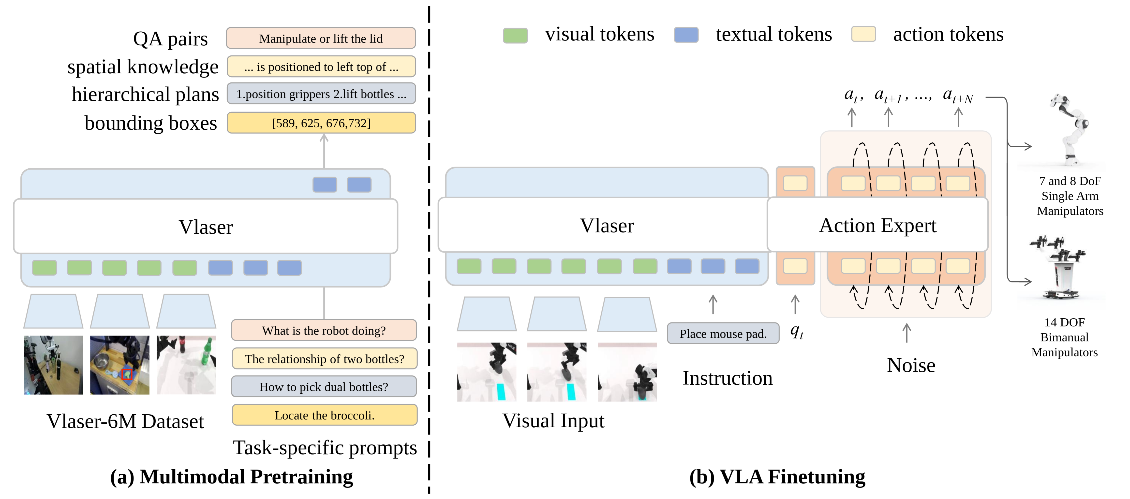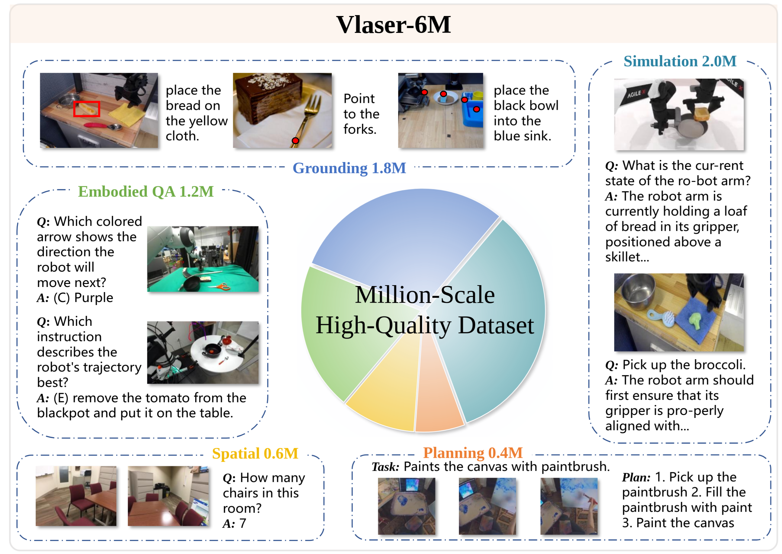 - 视觉输入:机器人场景的图像数据(来自 Vlaser-6M 数据集);