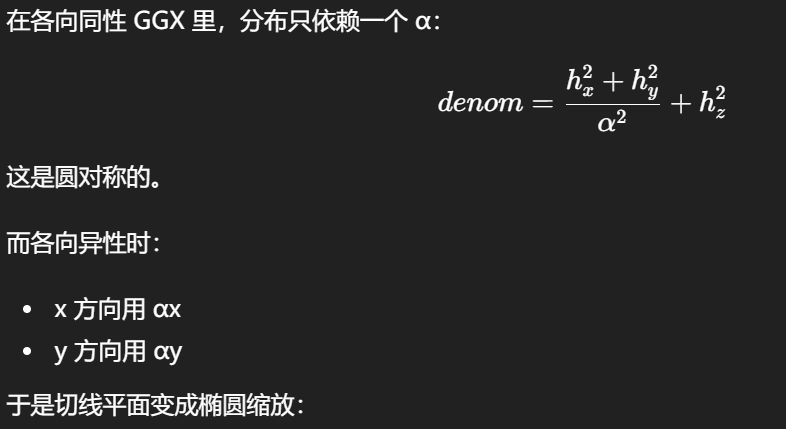 "同一个全局 H,在切线平面里投影到 T/B 方向后,分别按 αx、αy 缩放,最后形成一个'椭圆度量'下的长度平方;GGX 用这个椭圆度量的长度来决定该方向出现的概率密度。"
