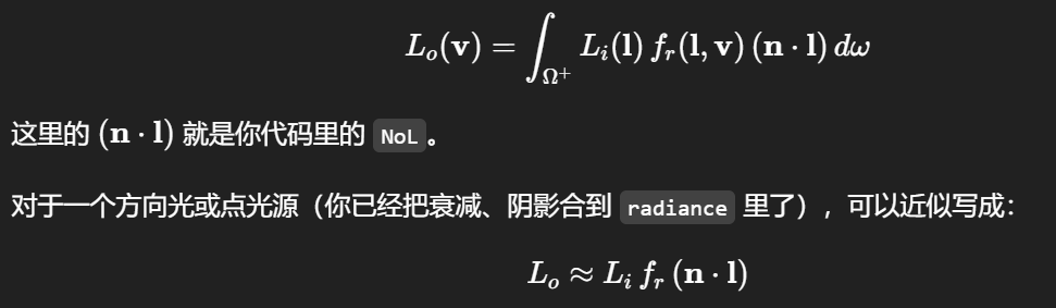 NoL 是"入射几何项",把 radiance 转成 irradiance(接受能量随倾角减少)