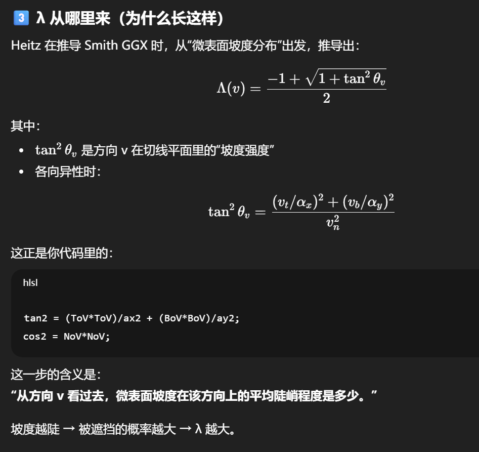 λ(v) 表示:在给定观察/光照方向 v 下,一个微表面法线被其它微表面遮挡的"期望遮挡程度"。