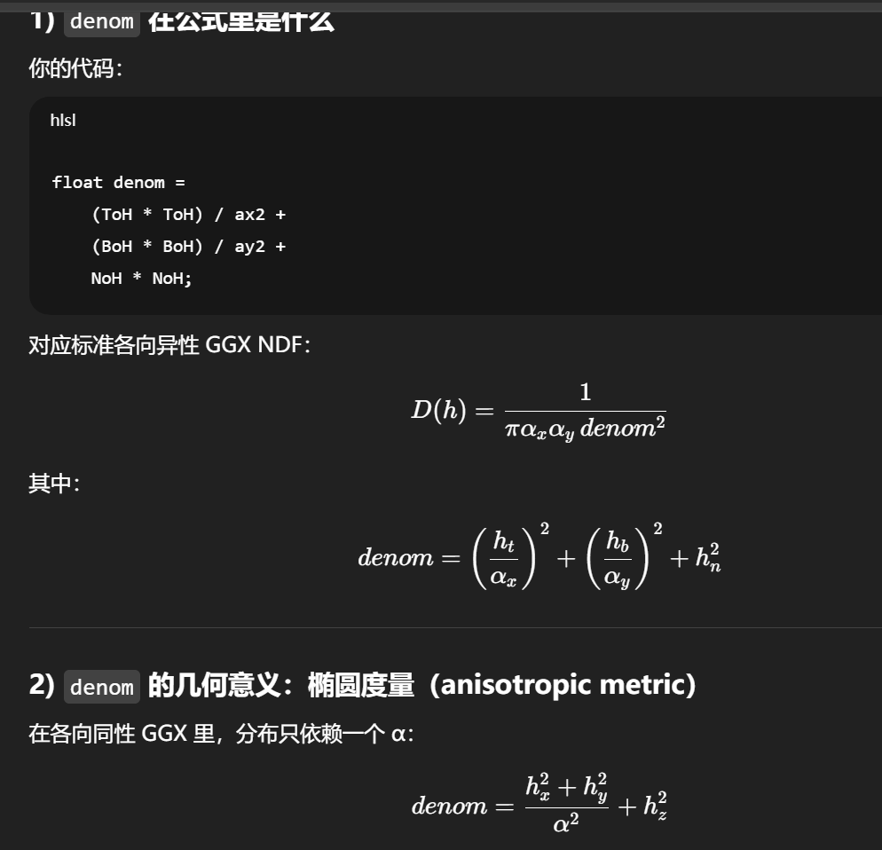 denom 是"半程向量在各向异性粗糙度椭圆下的距离平方",决定 D(h) 的衰减。