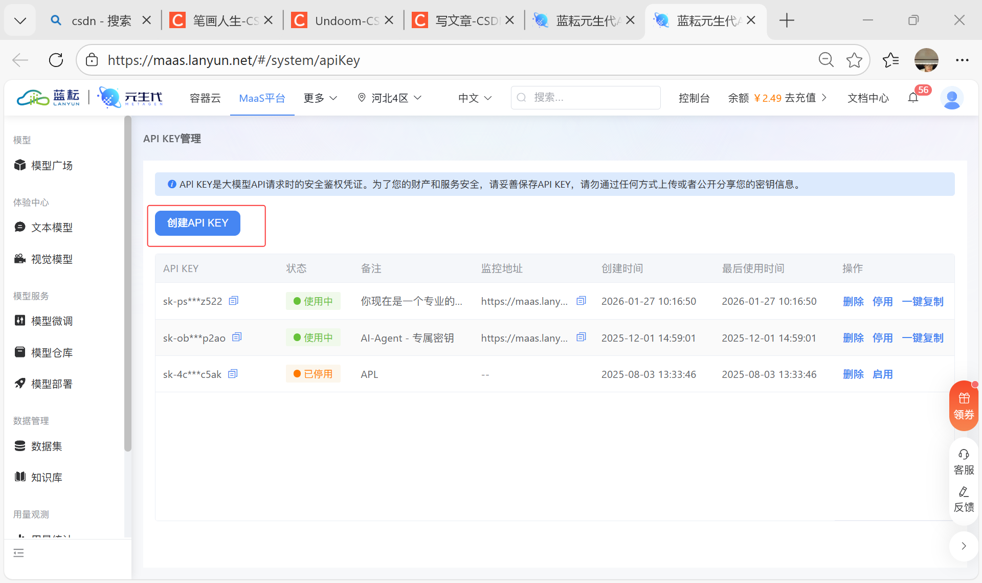 打开蓝耘官网,左侧【常用模块】找到【API Key管理】