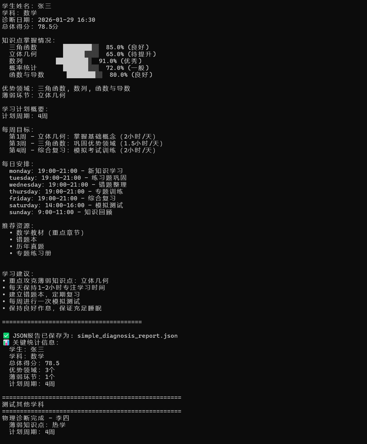 print(f" 计划周期:{report['learning_plan']['duration_weeks']}周")