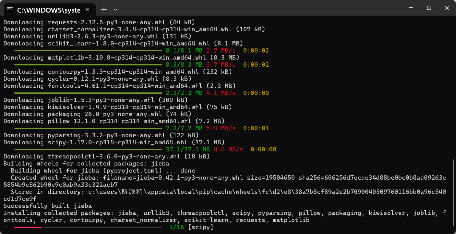 pip install requests pandas scikit-learn matplotlib jieba