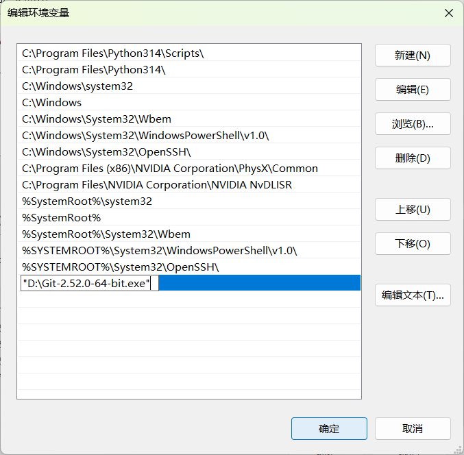 在弹出的 "编辑环境变量" 窗口中,点击 "新建",然后把你刚才找到的 Git bin目录路径(例如 C:\Program Files\Git\bin)填进去。