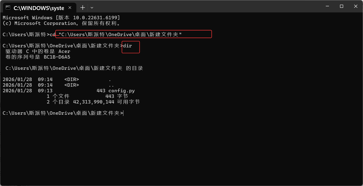 然后输入"dir" 回车,就可以打开项目根文件查找自己想要运行的那个代码文件在不在这个目录