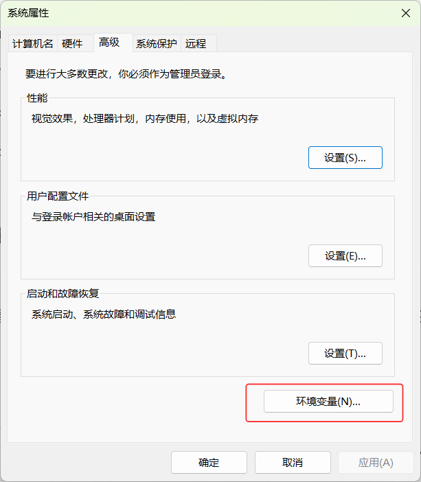 - 在 "系统属性" 窗口的 "高级" 标签页下,点击下方的 "环境变量" 按钮。