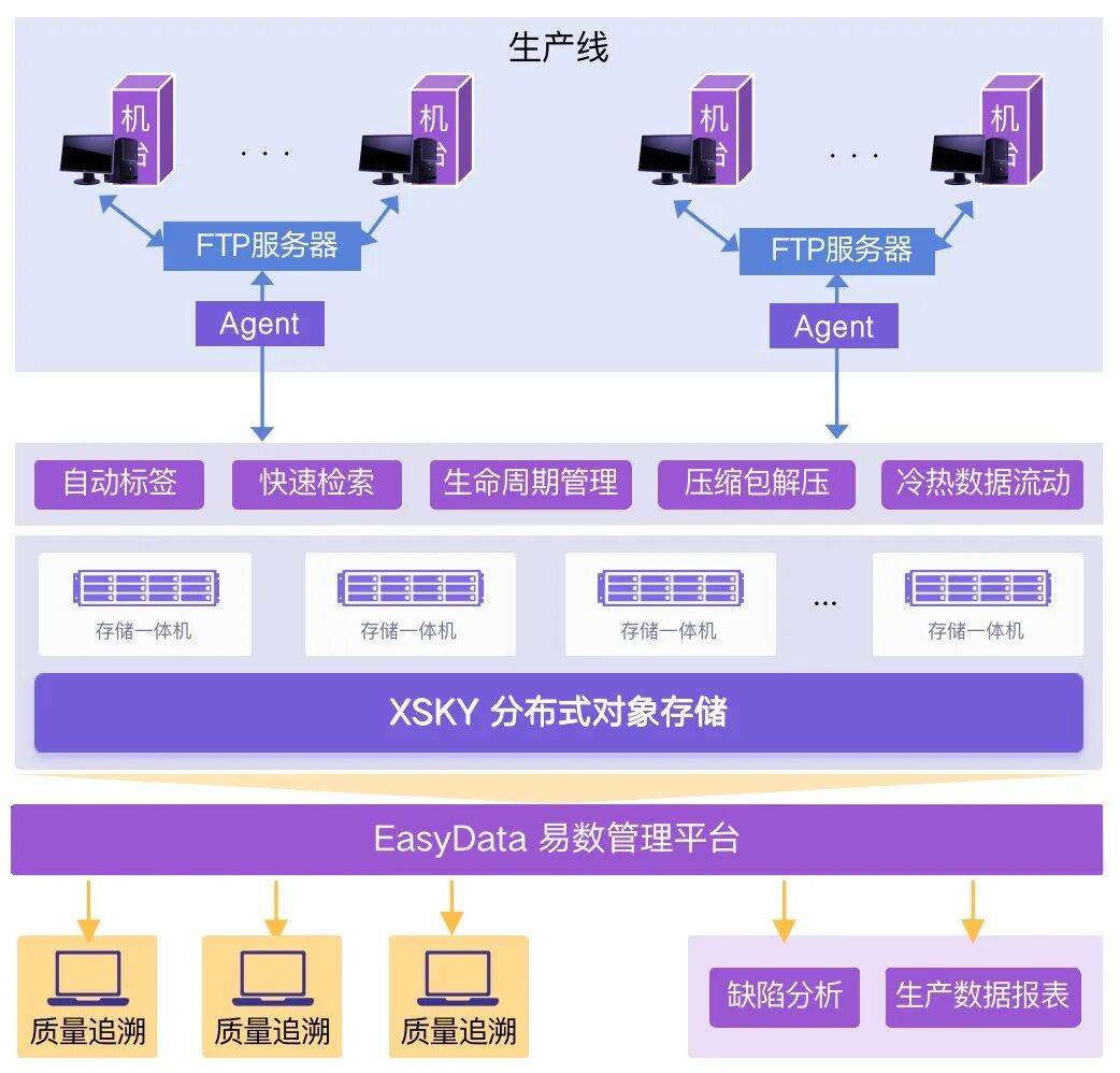 整体方案采用全分布式架构,其容量和性能会随节点数量呈线性增长,可支持工厂未来千亿级文件管理。同时,能确保多并发、高带宽和低时延读写。构建了涵盖质检数据采集、处理、存储、管理、追溯等环节的统一全业务流程平台,可满足众多产线设备数据同时采集存储、压缩包数据自动解压与打标签、跨应用数据迁移等需求。