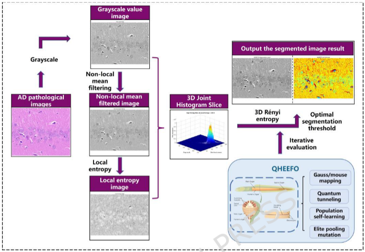阿尔茨海默病(AD)的早期诊断高度依赖于脑病理图像的精确分割,但传统多阈值图像分割方法在噪声抑制和空间结构信息利用方面存在不足,难以应对 AD 图像中复杂纹理与高信息密度的问题。为此,本文提出了一种融合灰度强度、非局部均值和局部熵的三维 Rényi 熵模型,通过联合直方图同时表征灰度、空间与纹理特征,从而更全面地刻画图像不确定性。针对高维阈值优化难题,本文设计了一种量子混合电鳗觅食优化算法(QHEEFO),引入量子隧穿策略、量子控制因子和对数增强扰动机制,以提升全局搜索能力并避免早熟收敛。