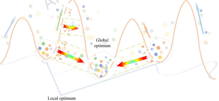 EEFO算法仅依据个体适应度讲行位置更新,个体间交互完全由话应度差异驱动,在多峰或高维问题中灵活性不足,易导致搜索停滞和早熟收敛。为此,本文引入基于量子隧穿效应的改进策略,通过量子因子 α \alpha α与对数变换,使搜索个体能够跨越低适应度区域而不依赖适应度梯度,从而显著增强全局搜索能力并有效缓解早熟收敛问题: