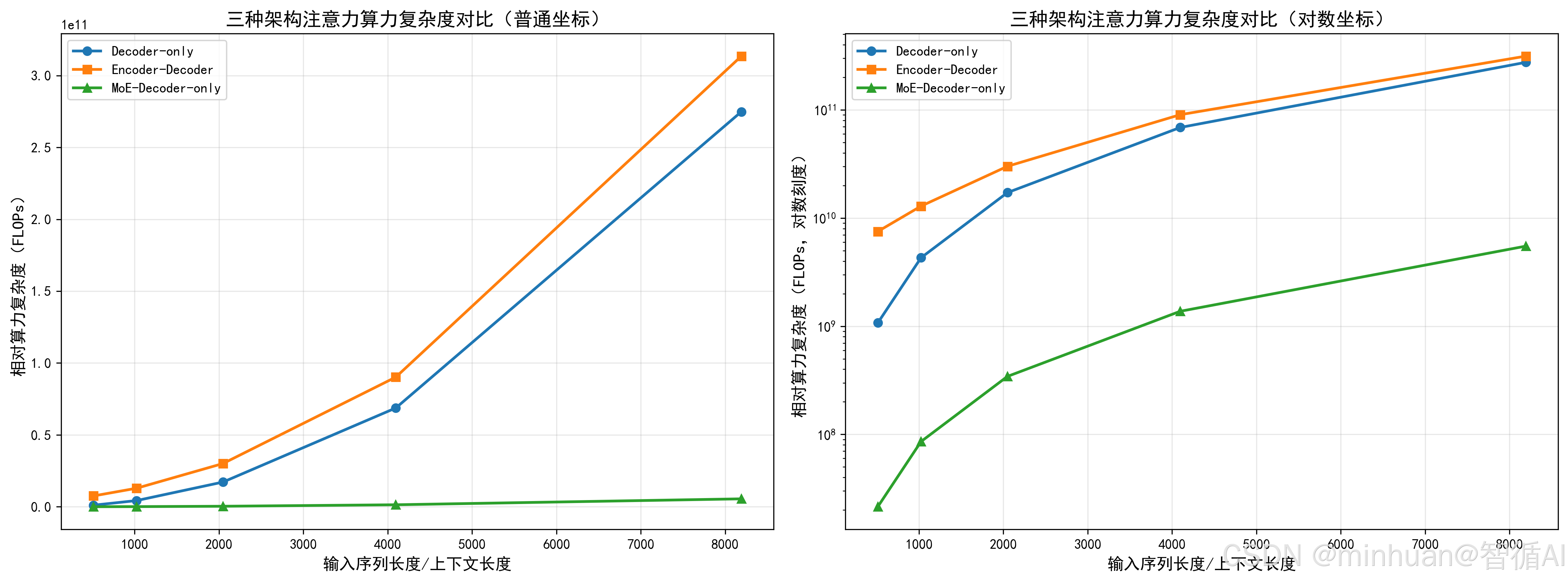 - 子图 2(对数坐标):可以更清晰地看到三条曲线的增长趋势,MoE 的曲线增长最为平缓,Decoder-only 次之,Encoder-Decoder 最陡,直观展示了 "平方级增长" 和 "稀疏优化" 的差异。