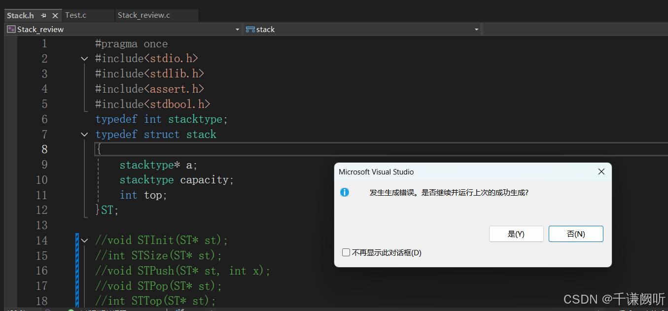 cpp// 支持动态增长的栈 typedef int STDataType; typedef struct Stack { STDataType* _a; int _top; // 栈顶 int _capacity; // 容量 }Stack; // 初始化栈 void StackInit(Stack* ps); // 入栈 void StackPush(Stack* ps, STDataType data); // 出栈 void StackPop(Stack* ps); // 取栈顶元素 STDataType StackTop(Stack* ps); // 获取栈中有效元素个数 int StackSize(Stack* ps); // 检测栈是否为空,如果为空返回非零结果,如果不为空返回0 int StackEmpty(Stack* ps); // 销毁栈 void StackDestroy(Stack* ps);以上是头文件的代码,用于声明,定义了Stack这一个结构体。这些足以基本栈的基本操作。声明了之后,才可以被调用。当然定义也可以和声明一起写,因为当你把定义写了后,也完成了声明,定义是一种特殊的声明。声明就如上面代码一样,仅仅显示返回类型,和参数类型。