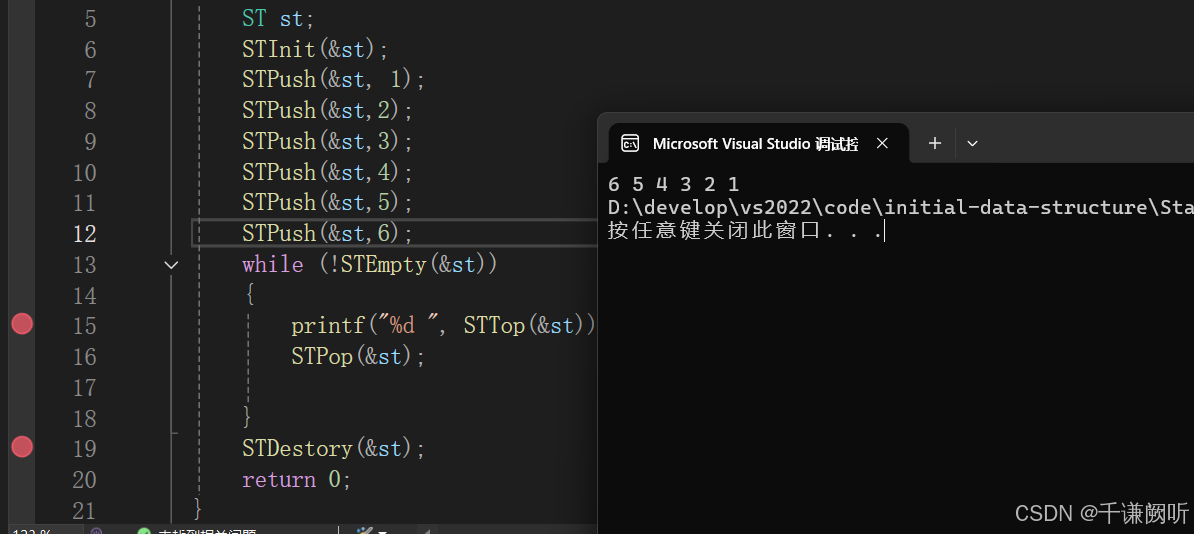 而是不是为空怎么判断,就是看大小是不是0,不是0就返回false,为0就返回true,那!=ture,意思就是false,而assert遇到false,就会拦截,成本很低。而我设置的初始化top=0,也就是栈顶元素的下一个位置是起始位置,那就说明没有元素,要是top初始化为-1,那么当前位置就是起始位置,top==-1就是空