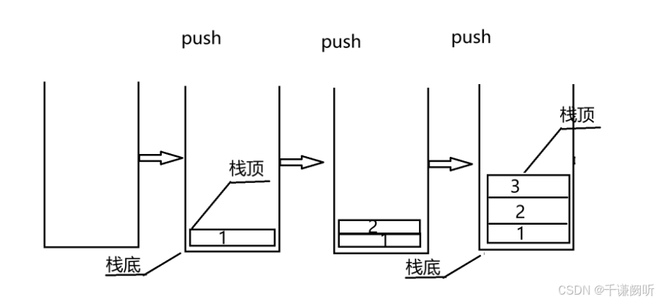 此图是一个空的,即当前无元素到压入三个元素的栈,最底下是栈底,最顶部的元素上是栈顶。