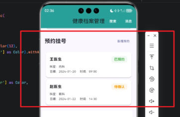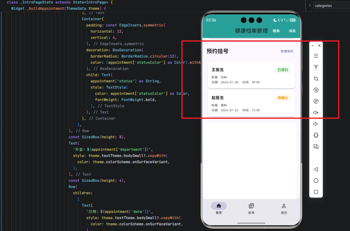 appointments是一个列表,每个元素是 Map,存储医生、科室、日期、时间、状态以及状态颜色。- 这里使用硬编码模拟真实数据,实际可替换为后端 API 请求。