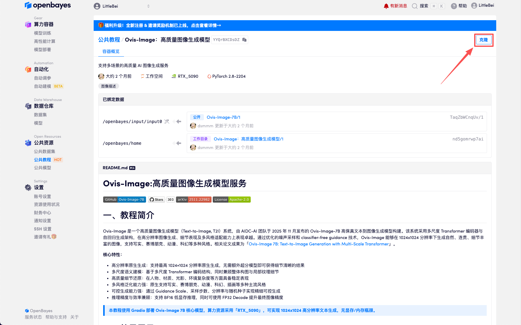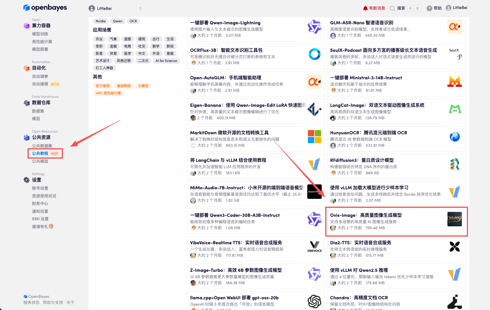首先点击「公共教程」,找到「 Ovis-Image:高质量图像生成模型」,单击打开。