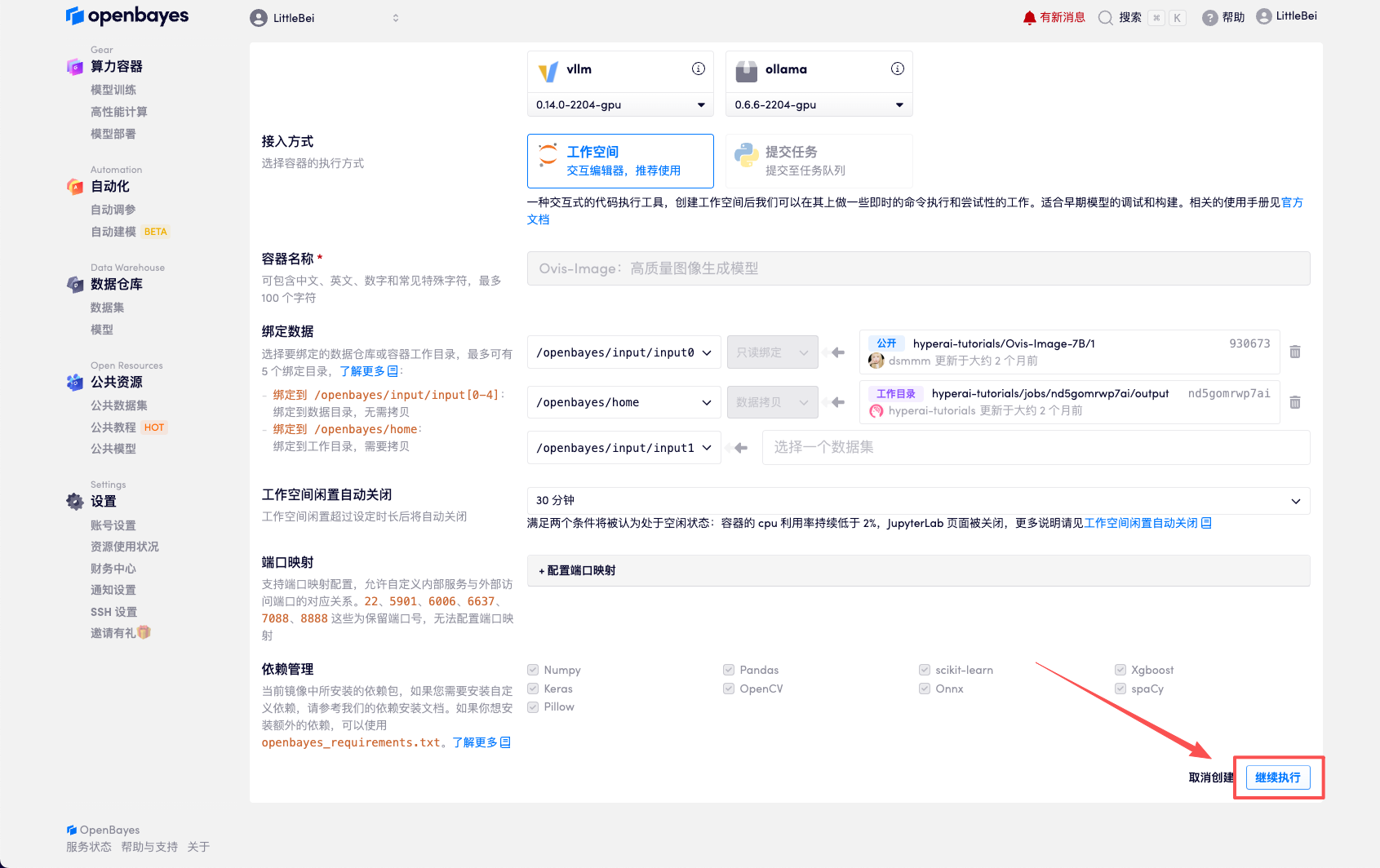 在当前页面中看到的算力资源均可以在平台一键选择使用。平台会默认选配好原教程所使用的算力资源、镜像版本,不需要再进行手动选择。点击「继续执行」,等待分配资源。