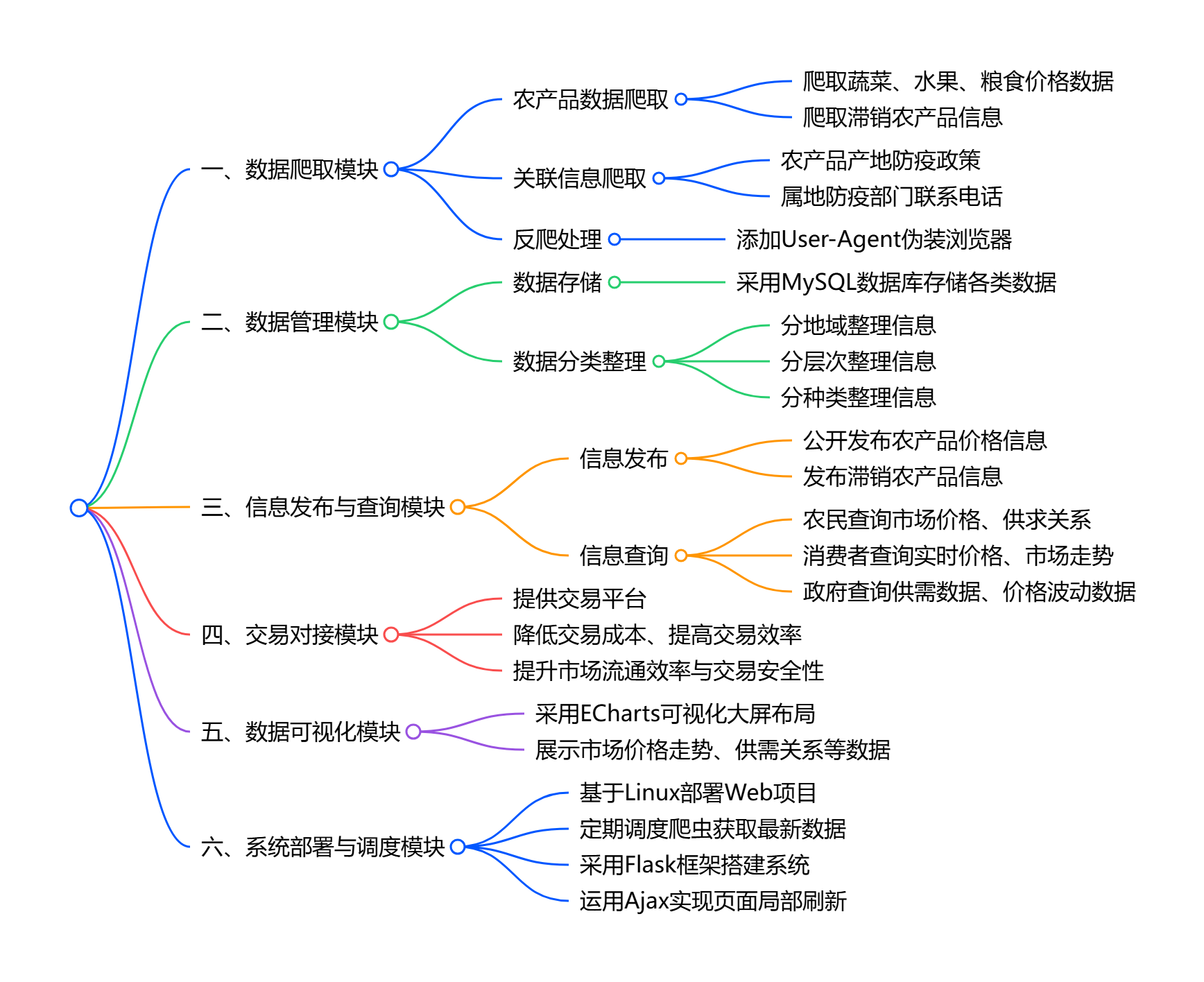 各位老师好,我是计算机科学与技术专业的H同学,我的毕业设计题目是《助农信息发布系统设计与实现》。本系统旨在解决农产品供需信息不对称导致的滞销问题,通过Python网络爬虫技术定时采集各大农产品交易平台的价格数据,结合Flask轻量级Web框架构建B/S架构的信息发布平台。系统核心功能模块包括:数据采集模块(基于Requests和正则表达式爬取蔬菜、水果、粮食价格)、数据存储模块(MySQL数据库设计)、可视化展示模块(利用ECharts构建价格走势大屏和地域分布图)、以及用户交互模块(支持Ajax异步刷新实现无刷新查询)。技术栈方面,后端采用Python+Flask+MySQL,前端使用HTML5+ECharts+Ajax,部署环境选用Linux服务器配合Crontab实现爬虫定时调度。系统最终将为农民提供实时市场定价参考,为政府决策提供数据支撑,同时帮助消费者获取优质农产品信息。