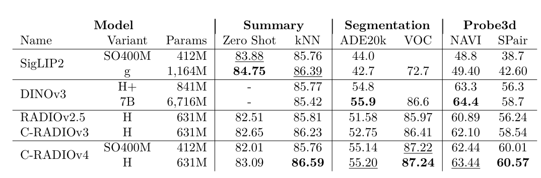 表 1 | 不同视觉编码器之间的比较。在密集任务上,C-RADIOv4以少得多的参数与DINOv3相竞争。