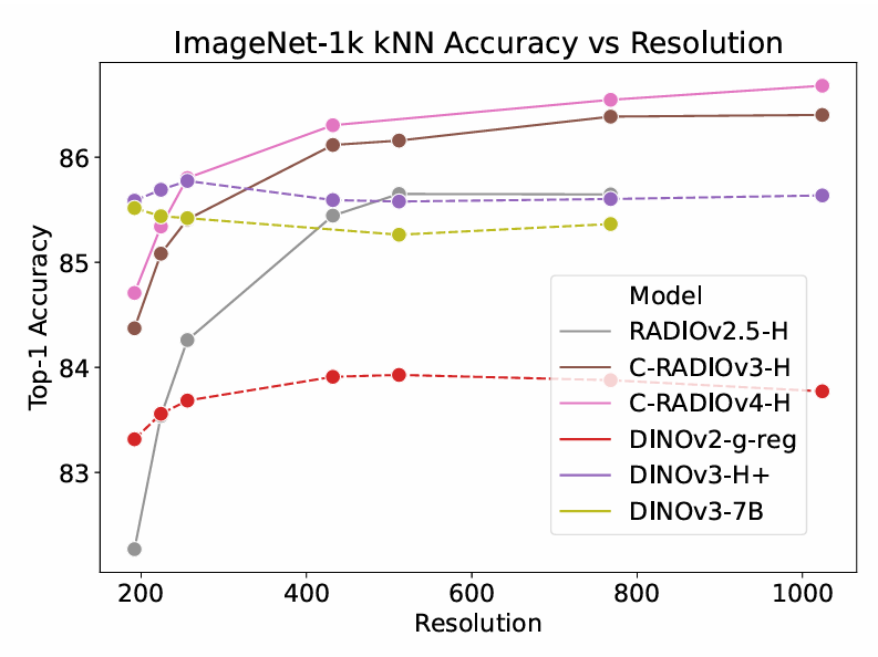 我们能够通过k-近邻(k-Nearest Neighbors)分类直接与DINOv2/3模型进行比较,如DINOv2和先前RADIO工作所用。我们在图4中展示了这些结果,可以看到DINOv3在k-NN分类上相比DINOv2有了巨大改进,然而,分辨率缩放能力主要集中在192-256像素附近,更高分辨率会下降。对于RADIO,C-RADIO模型相对于RADIOv2.5有显著改进,C-RADIOv4总体上比C-RADIOv3略好。这表明C-RADIOv3在零样本方面的问题更可能源于匹配SigLIP2的具体问题,而不是缺乏良好的整体表征。尽管如此,C-RADIOv4对两个任务仍然是一个改进。有趣的是,DINOv3的H+模型在kNN分类上优于7B模型。从256像素开始,C-RADIOv4-H能够匹配或超过DINOv3。