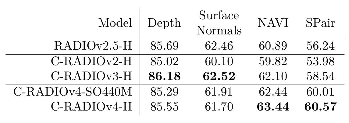 表 4 | 各种RADIO模型的完整Probe3d\[10\]评估。所有指标越高越好。