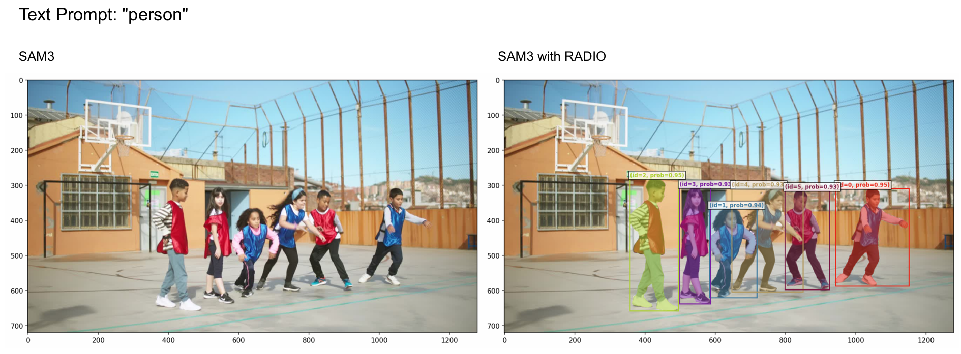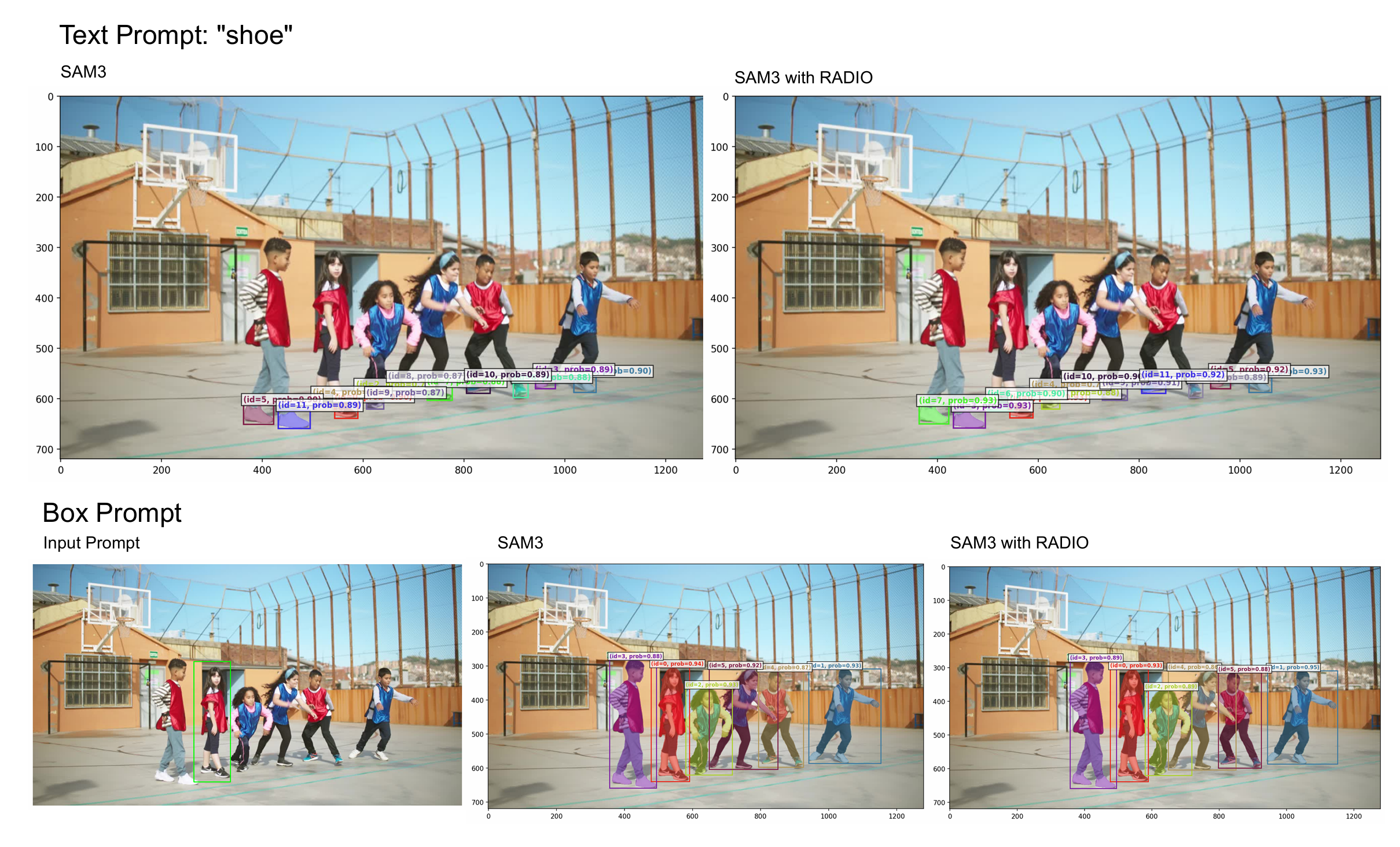 图 6 | SAM3图像演示的掩码结果,要么使用常规SAM3,要么将视觉编码器替换为RADIO。RADIO能够复现SAM3的结果。
