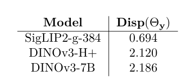其中x是学生预测,y是教师预测,μy\mu_{y}μy是y的期望方向,Disp(Θy)\text{Disp}(\Theta_{y})Disp(Θy)是y的角度离散度,我们用它来归一化教师之间的锥体半径,使学生能够专注于相对角度,并防止一个教师主导另一个教师。我们在表3中报告了发现的角度离散度,显示SigLIP2和DINOv3之间存在显著差异。如果不加以缓解,DINOv3将主导损失项,使学生偏向于匹配它,而牺牲对SigLIP2的匹配。