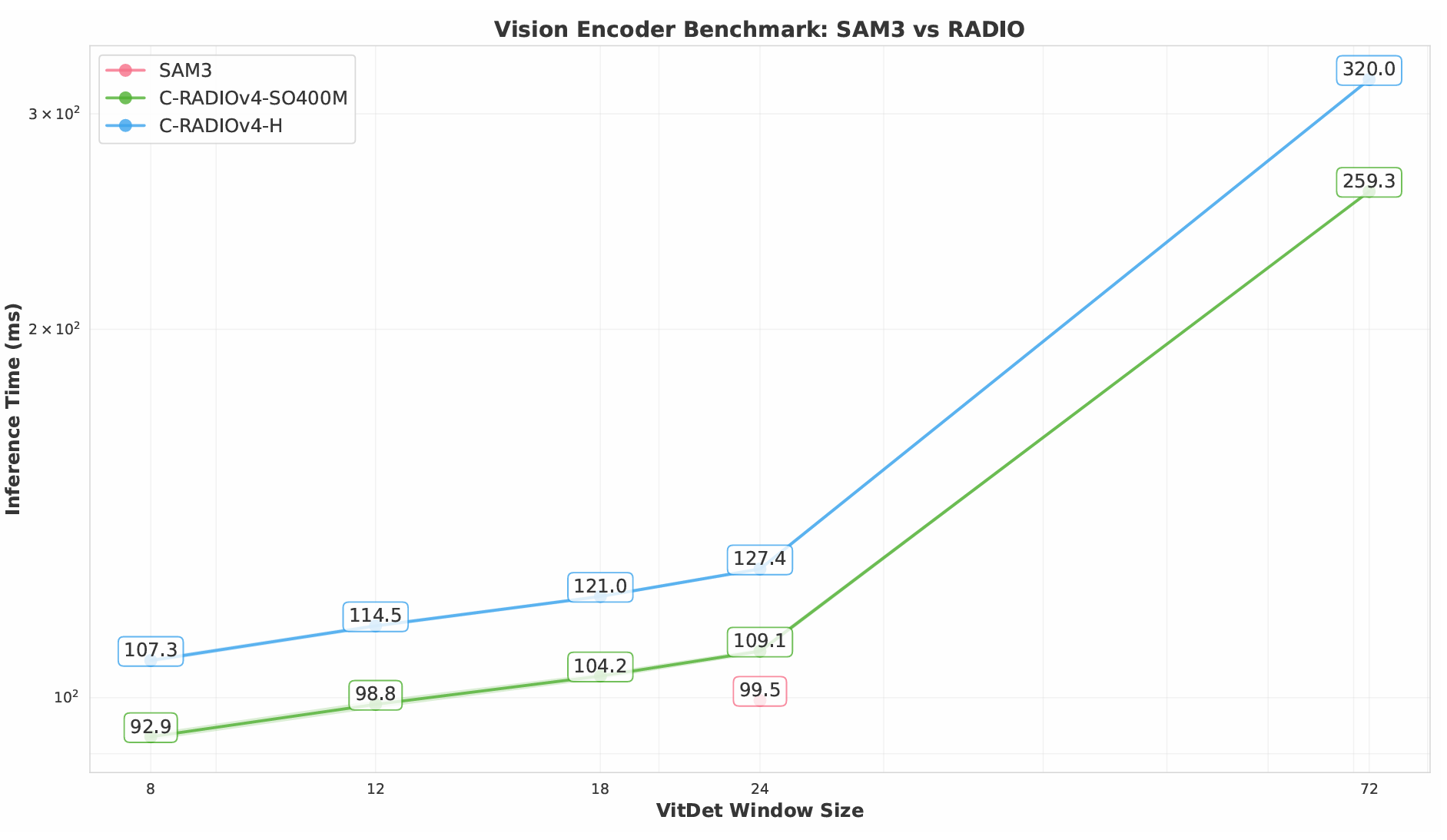 C-RADIOv4支持"ViTDet模式"[14]^{[14]}[14],该模式允许模型要么以完全全局注意力运行(例如,禁用ViTDet模式),要么以大部分窗口注意力以及少数几层全局注意力运行。这可以通过构造模型时的"vitdet_window_size"标志来控制。SAM3使用ViT-L+架构,具有4个全局层,其余层使用24×2424 \times 2424×24标记的窗口。为了提高效率,C-RADIOv4支持6×66 \times 66×6到32×3232 \times 3232×32标记之间的任何窗口大小,唯一的限制是窗口大小乘以补丁大小需要能够整除输入图像分辨率。较小的窗口可能更快,因为它减少了自注意力[22][22][22]的二次惩罚,然而,硬件可能会减少/消