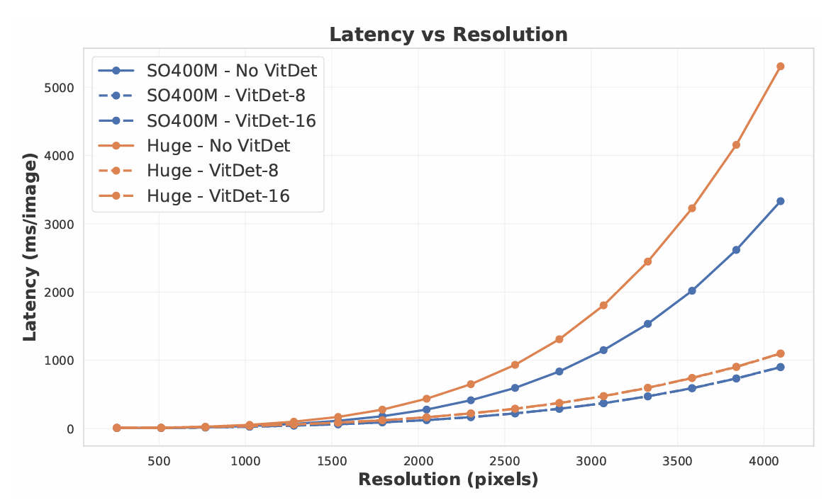 图 5 | 在A100上对两个版本的C-RADIOv4(有和没有指定窗口大小的ViTDet)进行延迟分析。窗口大小为8和16的ViTDet模式之间的延迟差异可以忽略不计。