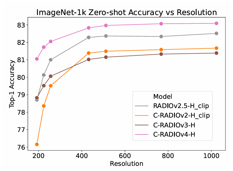 在图3中,我们展示了RADIOv2.5和各个版本的C-RADIO的零样本准确率。我们注意到RADIOv2.5和C-RADIOv2没有SigLIP2对齐头,因此我们使用它们的DFN CLIP头报告准确率。一般来说,DFN CLIP对学生模型来说更容易匹配,因此,直到C-RADIOv4之前,我们都无法达到先前RADIOv2.5模型的零样本准确率。所有显示的模型都表现出强大的分辨率缩放能力,然而,C-RADIOv4相对于之前的模型代际,显著改进了低分辨率下的分类。我们使用保持长宽比的尺寸调整,在1024像素分辨率下达到了最大零样本分数。