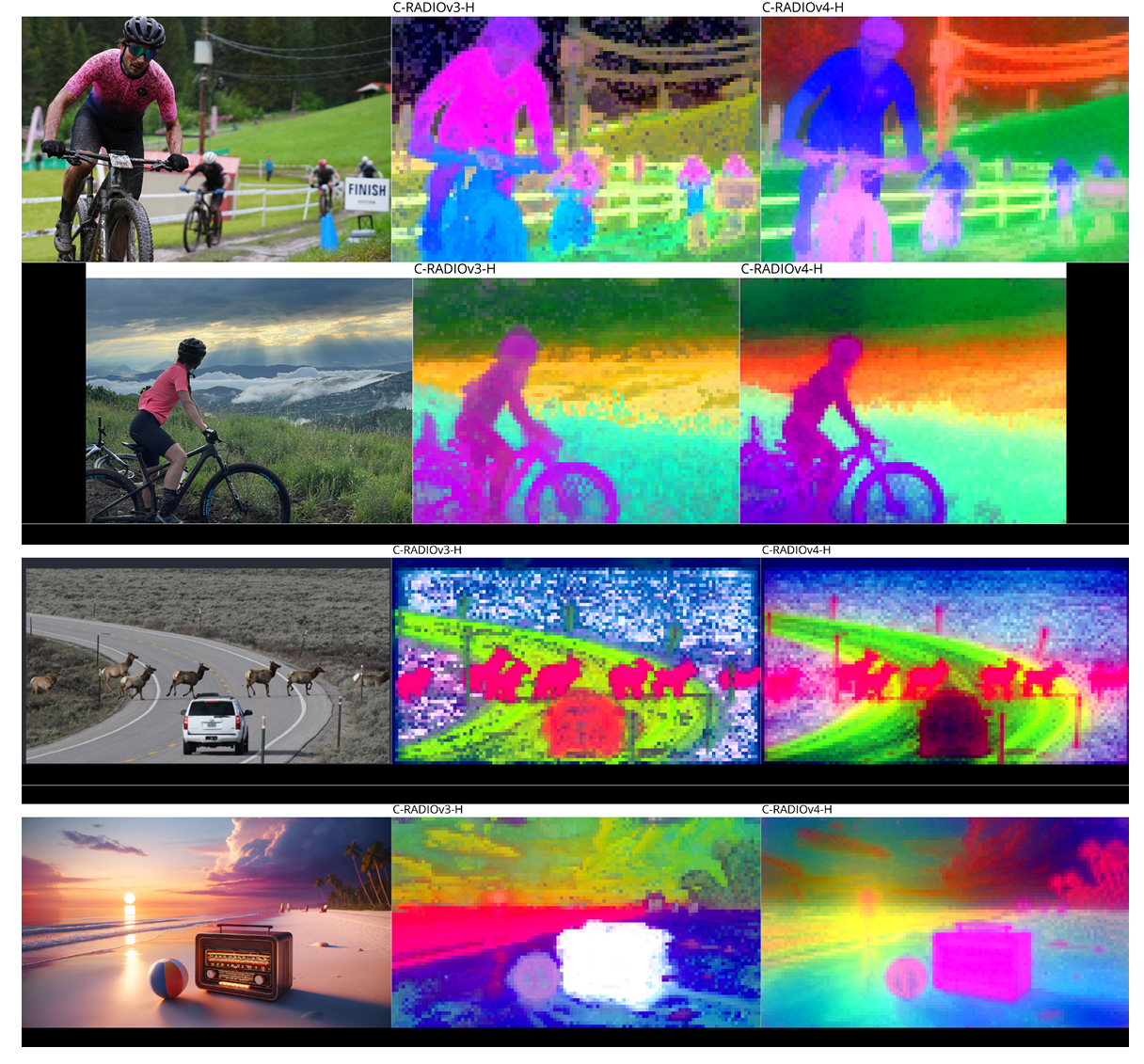 图 1 | PCA特征可视化,比较C-RADIOv3-H与C-RADIOv4-H。物体边界现在明显更清晰。