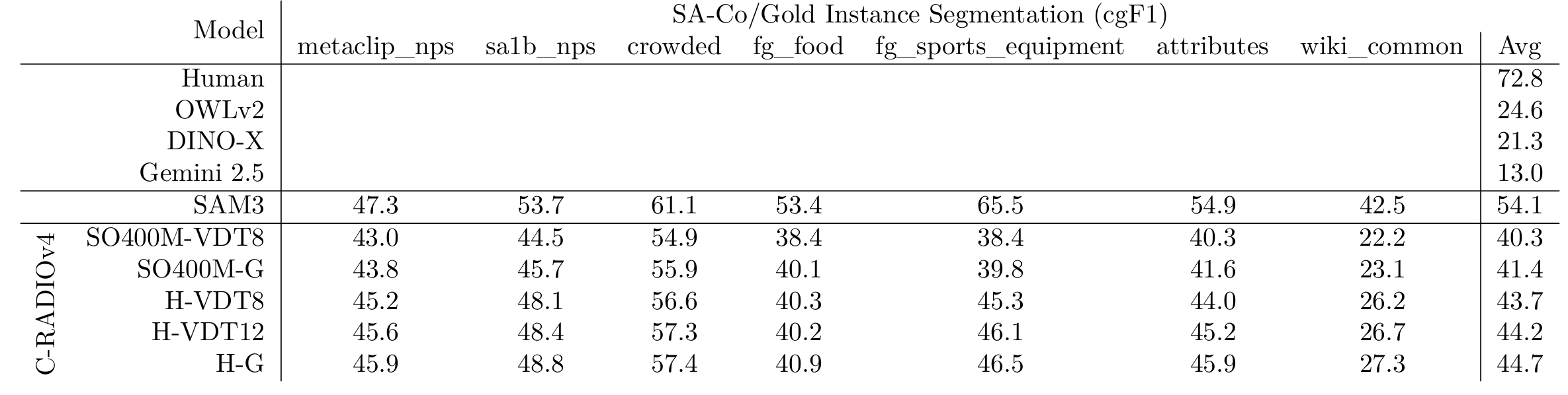旧版本的RADIO支持SAM[13][13][13]适配器,允许RADIO替换SAM的视觉编码器,同时使用其解码和记忆堆栈来执行分割。这种能力在RADSeg[3][3][3]等工作中找到了巧妙的用途,该工作使用SAM头来细化分割掩码,并为开放词汇语义分割设定了新的最先进水平。C-RADIOv4将我们的SAM支持升级到SAM3[6][6][6],再次允许替换核心视觉模型。我们在 https://github.com/mranzinger/sam3-radio 上有一个SAM3代码库的分支,演示了如何进行这种替换。在图6和图7中,我们展示了RADIO替换视觉编码器的能力,首先是SAM3提供的图像演示,第二是我们自己的图像,带有不同的查询。从质量上看,RADIO在代替SAM3的Perception Encoder[5][5][5]骨干时没有任何问题。在表5中,我们展示了在SA-Co/Gold[6][6][6]实例分割上的基准测试结果。C-RADIOv4成为第二好的模型,尽管,在替换SAM3视觉编码器的能力上存在不均。在由自然图像主导的"metaclip_nps"和"sa1b_nps"上,RADIO表现得相当好,与SAM3的差距较小,然而,在"fg_sports_equipment"和"wiki_common"上,差距变得更大。改进我们更好地匹配SAM3的能力是一个开放的研究方向。