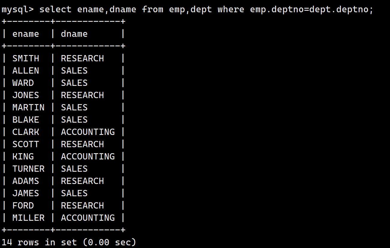mysql> select ename,dname from emp,dept where emp.deptno=dept.deptno;