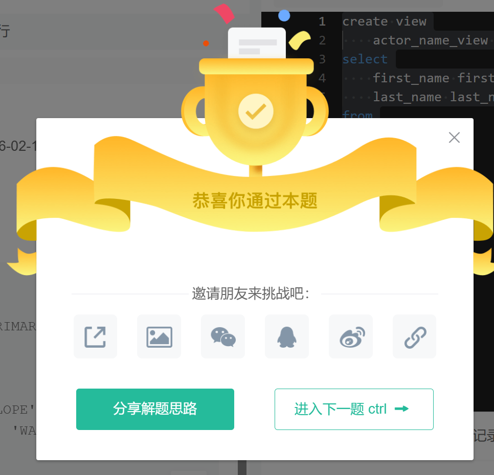针对actor表创建视图actor_name_view,只包含first_name以及last_name两列,并对这两列重新命名,first_name为first_name_v,last_name修改为last_name_v: