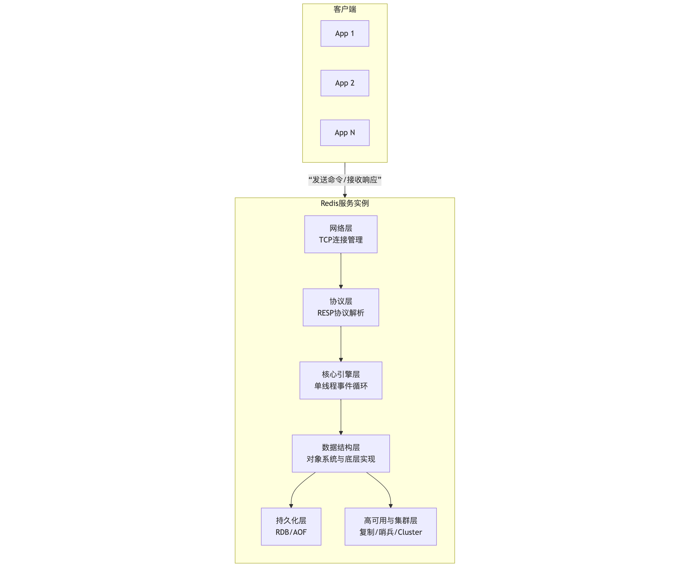 - 自下而上 :请求从网络层进入,经协议层解析为Redis命令,由单线程事件循环引擎 顺序执行。引擎调用数据结构层(对象系统)完成具体操作,并根据配置决定是否触发持久化或集群同步。