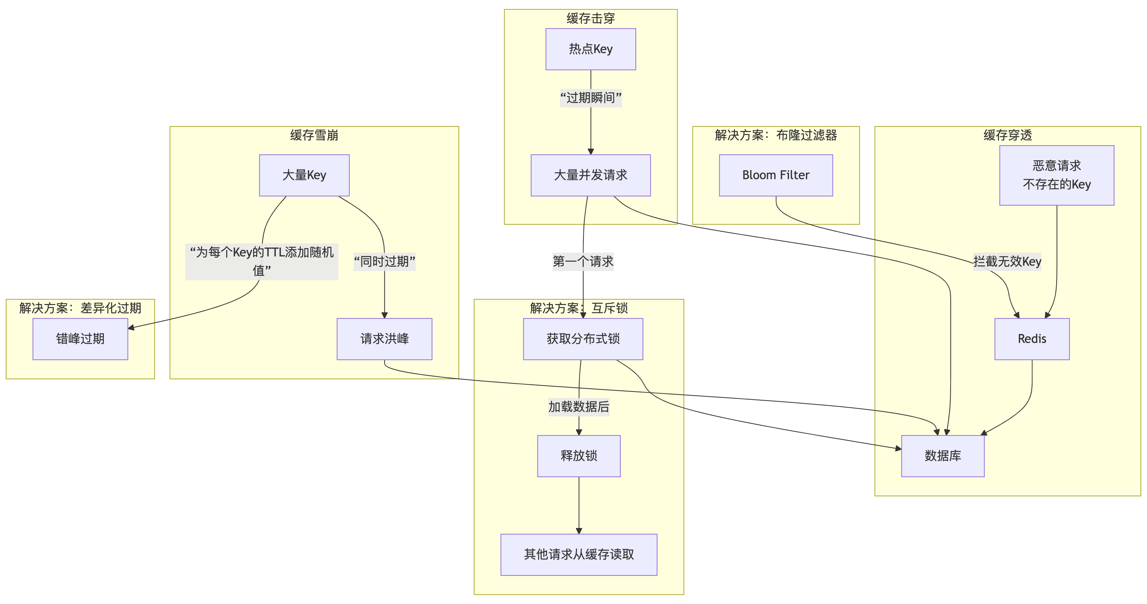 - 解决方案 :① 差异化过期时间 :在基础过期时间上,增加一个随机值(如