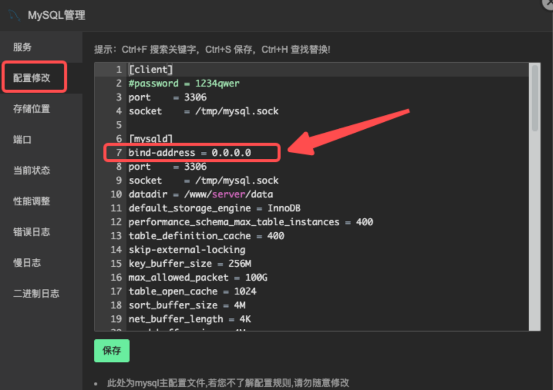 在 mysql 的【mysqld】配置下添加 bind-address = 0.0.0.0