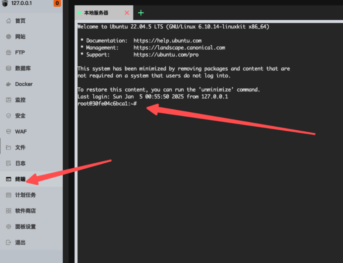 Docker ubuntu:22.04 镜像默认不会安装 ssh 服务,所以需要手动安装 ssh 服务并启动,不然宝塔面板中的终端功能将不可用