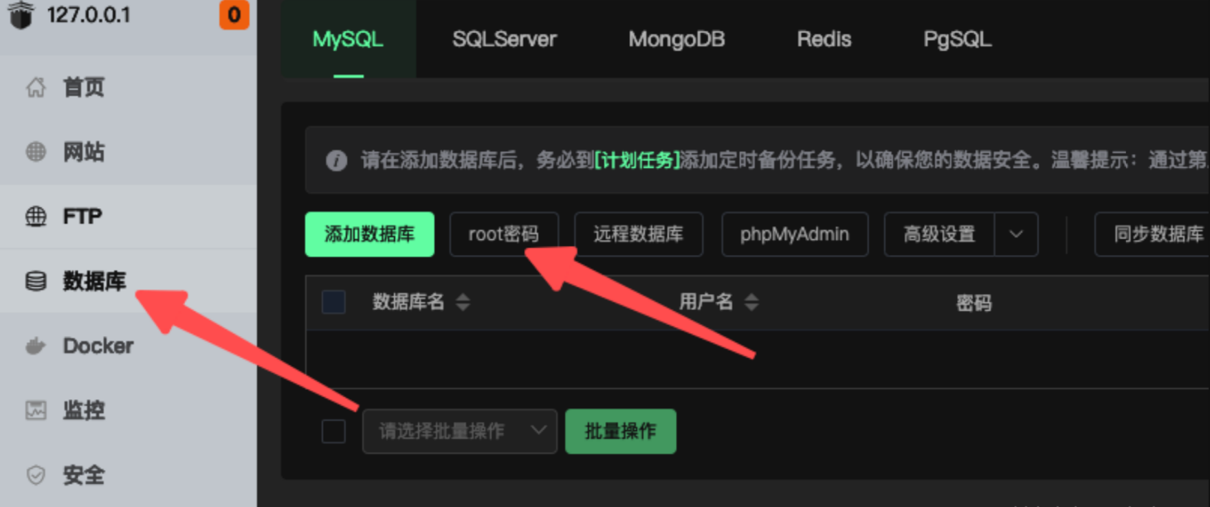 Mysql 的 root 默认密码查看可以在宝塔面板 -> 数据库 -> root 密码 中找到