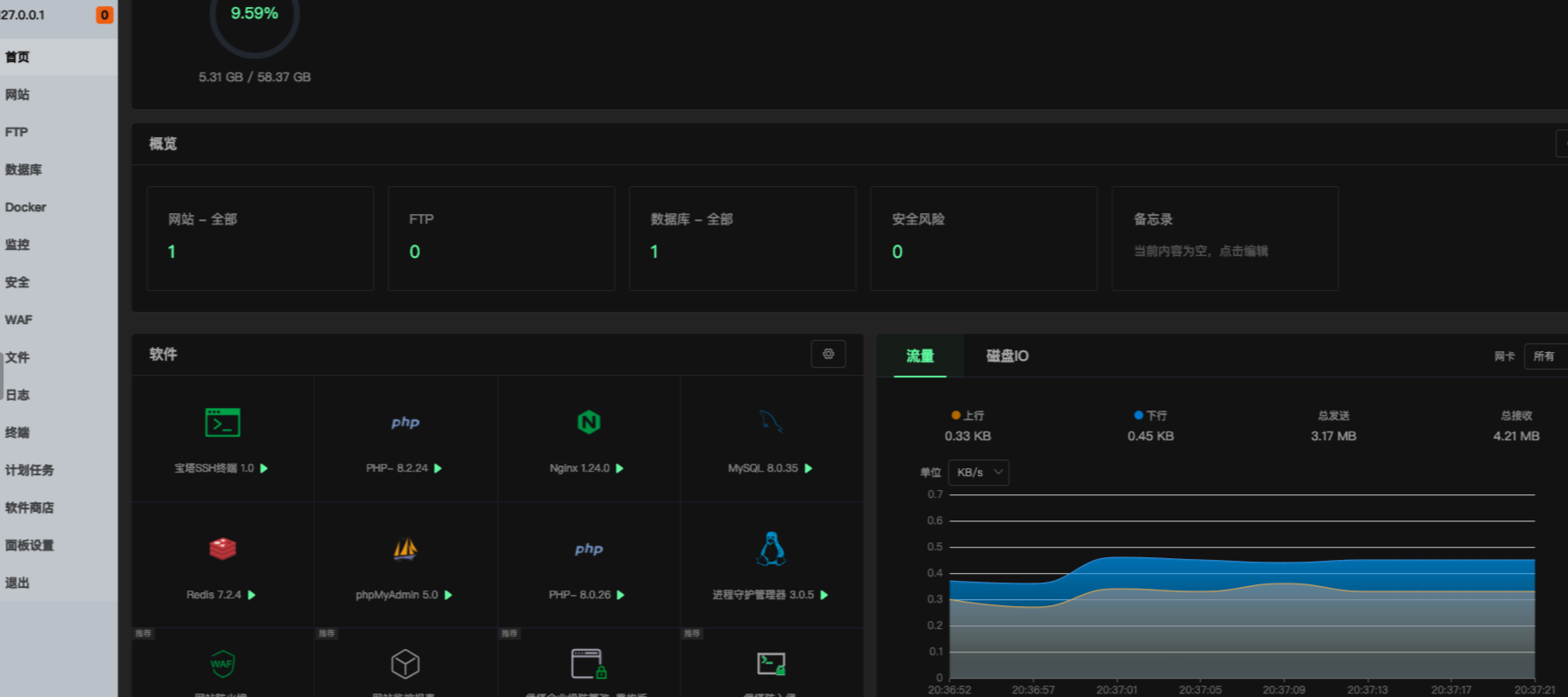 打开浏览器,访问 http://127.0.0.1:8888,输入用户名和密码,进入宝塔面板。宝塔面板安装完成后,可以在这里安装并管理 LNMP 环境。