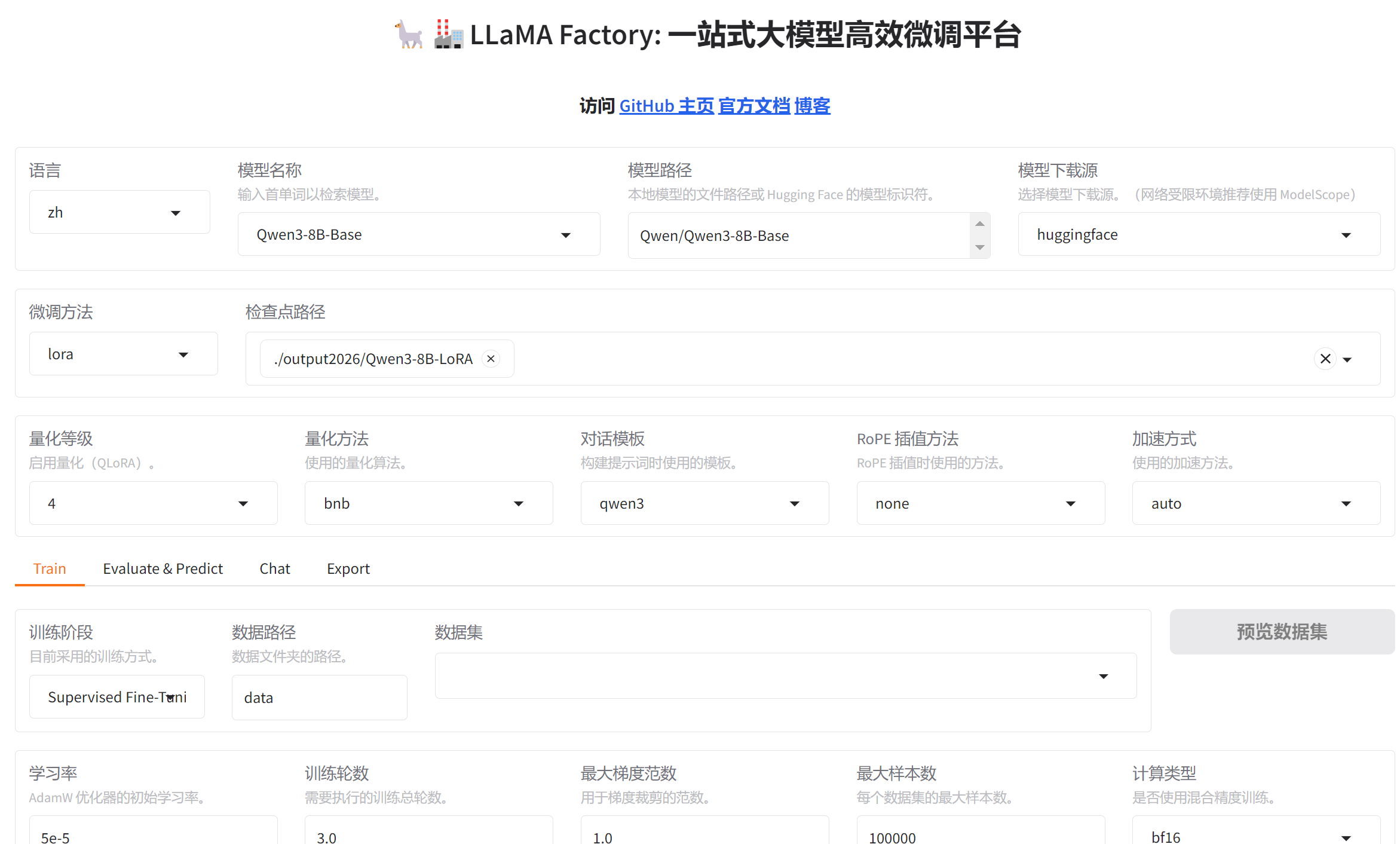 配置项 推荐值 说明 检查点路径 ./output/Qwen3-8B-LoRA可自定义输出路径 量化方法 bnb节省显存,适合消费级显卡 对话模板 qwen匹配 Qwen3 模型 RoPE 插值方法 none或dynamic若用长文本选 dynamic加速方式 auto自动适配硬件