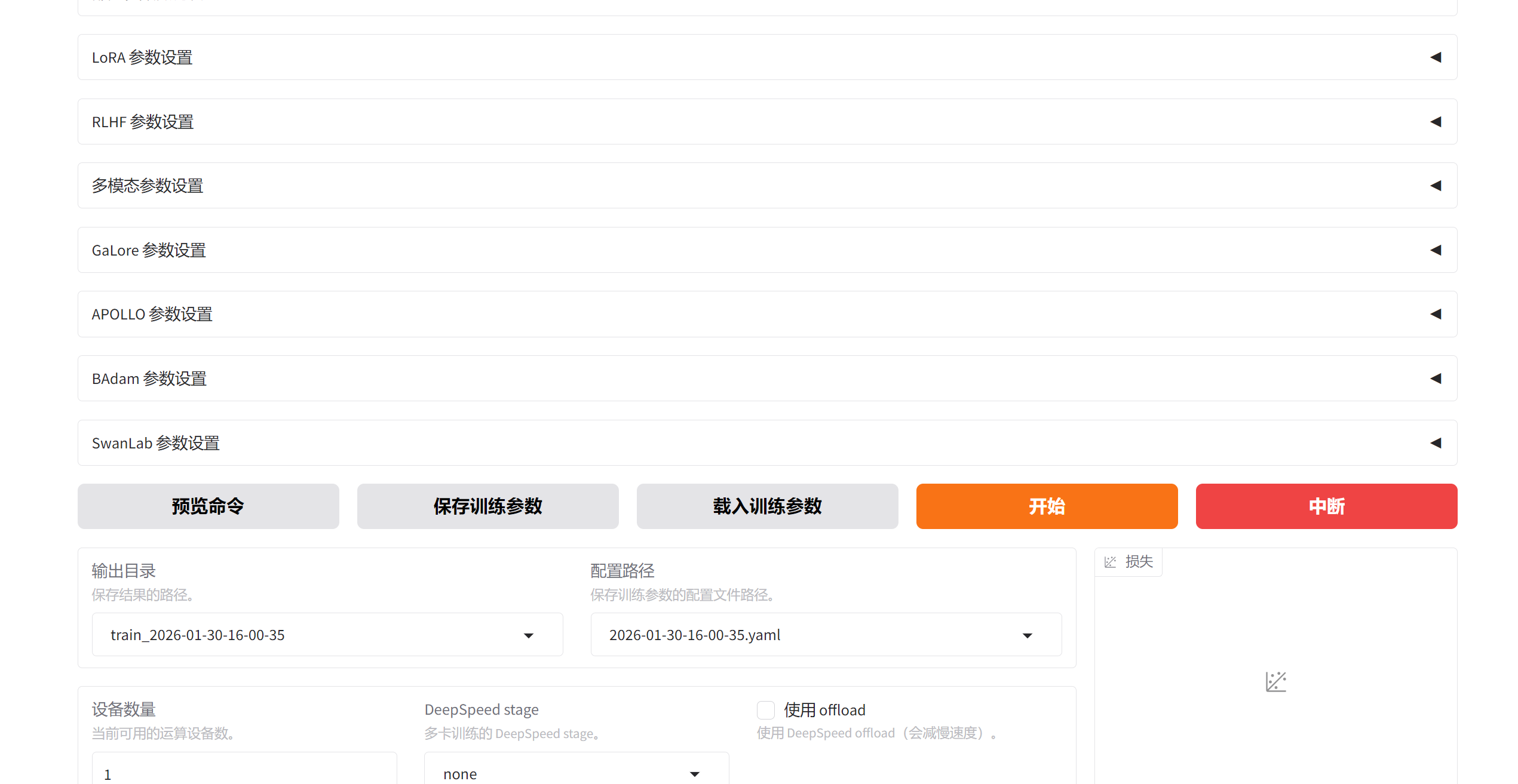 参数 推荐值 说明 输出目录 train_...自动生成,无需修改 配置路径 ...yaml自动保存配置 设备数量 1单卡训练 DeepSpeed stage none无需分布式训练 使用 offload 关闭 除非显存不足