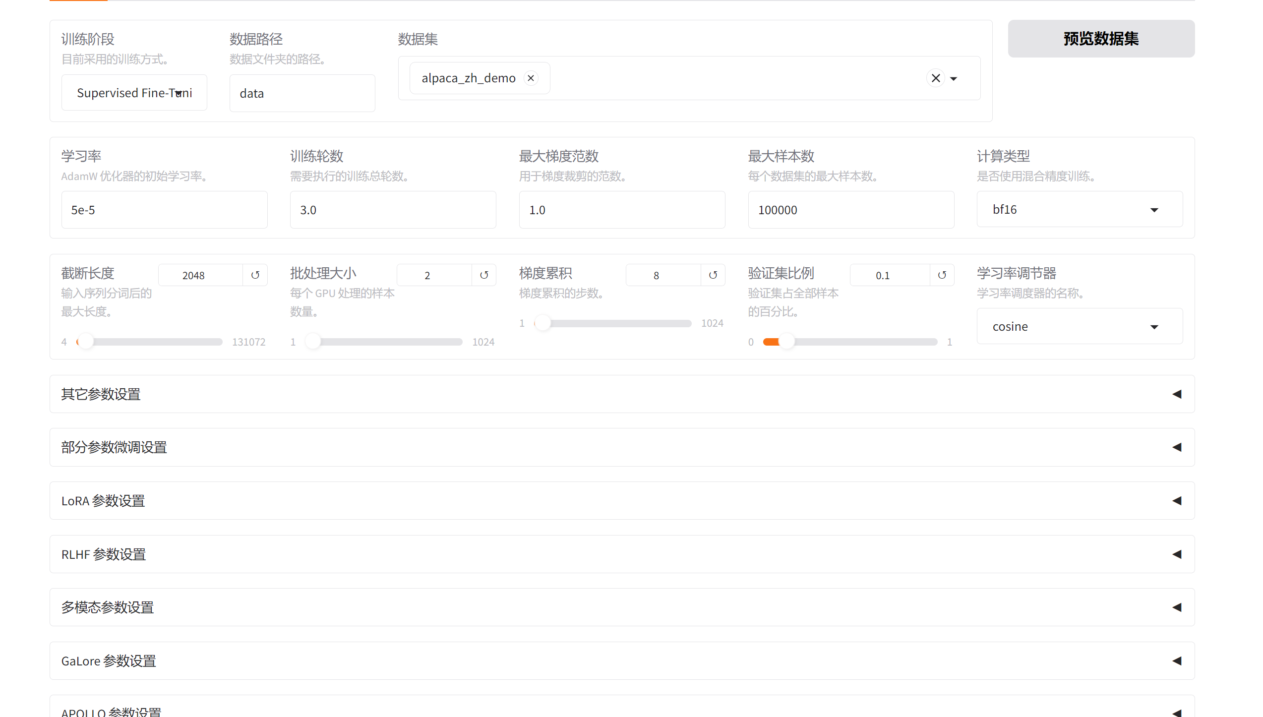 alpaca_zh_demo快速测试;- 自定义数据 → 不选任何数据集,只填"数据路径"。