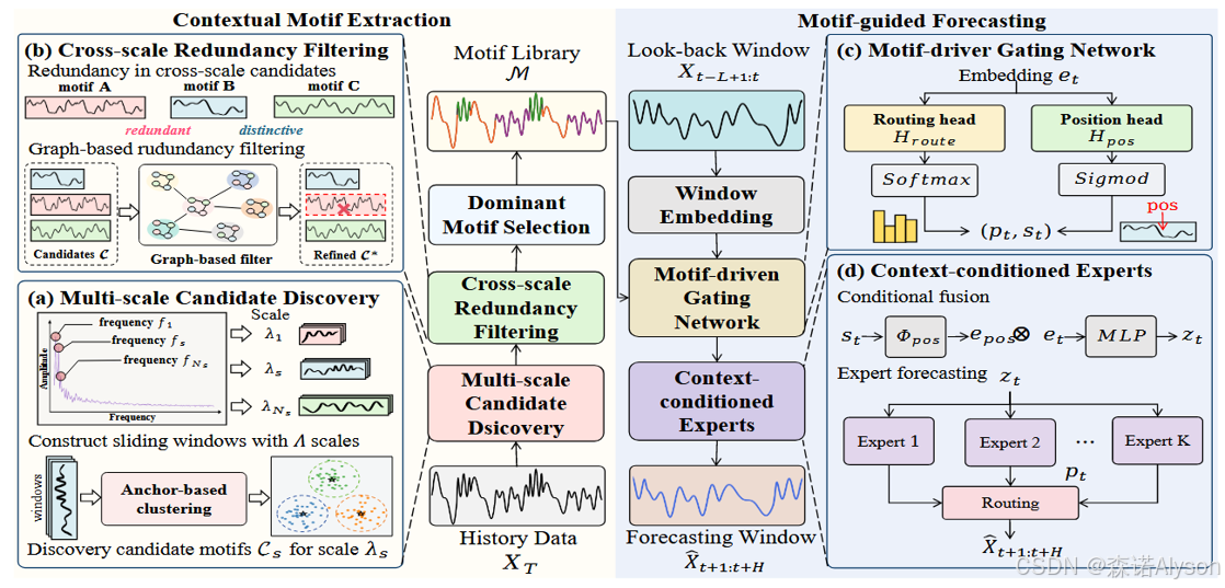 提出了一种新颖的上下文情境模式(Contextual Motif)引导的长期时间序列预测框架,旨在解决现有模型中存在的感受野瓶颈(Receptive Field Bottleneck)问题。