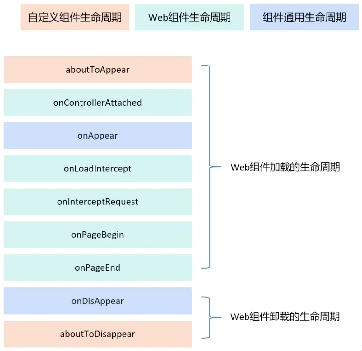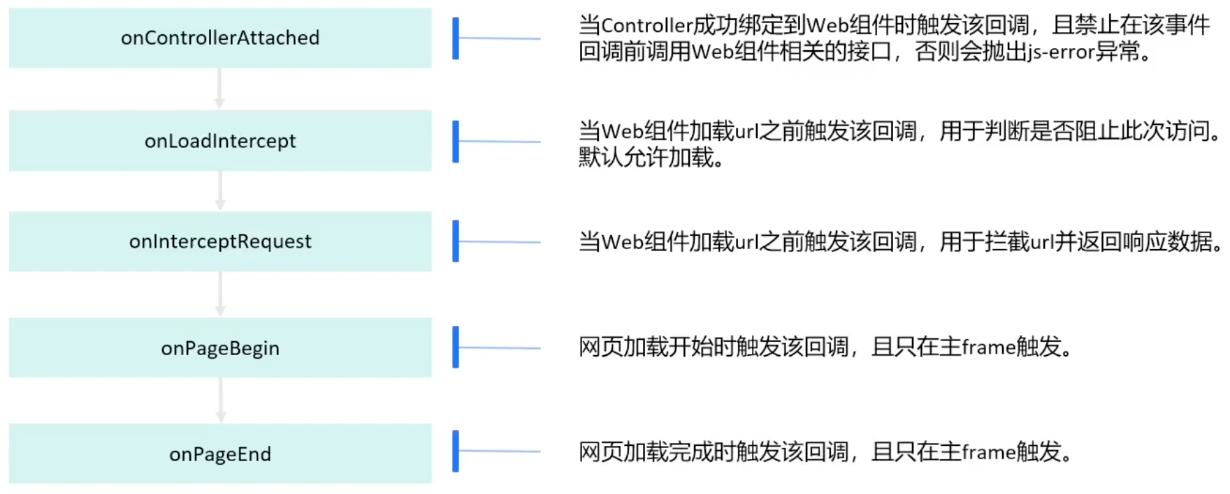 Web组件的生命周期主要包括:onControllerAttached、onLoadIntercept、onlnterceptRequest、onPageBegin、onPageEnds等,如下图所示。