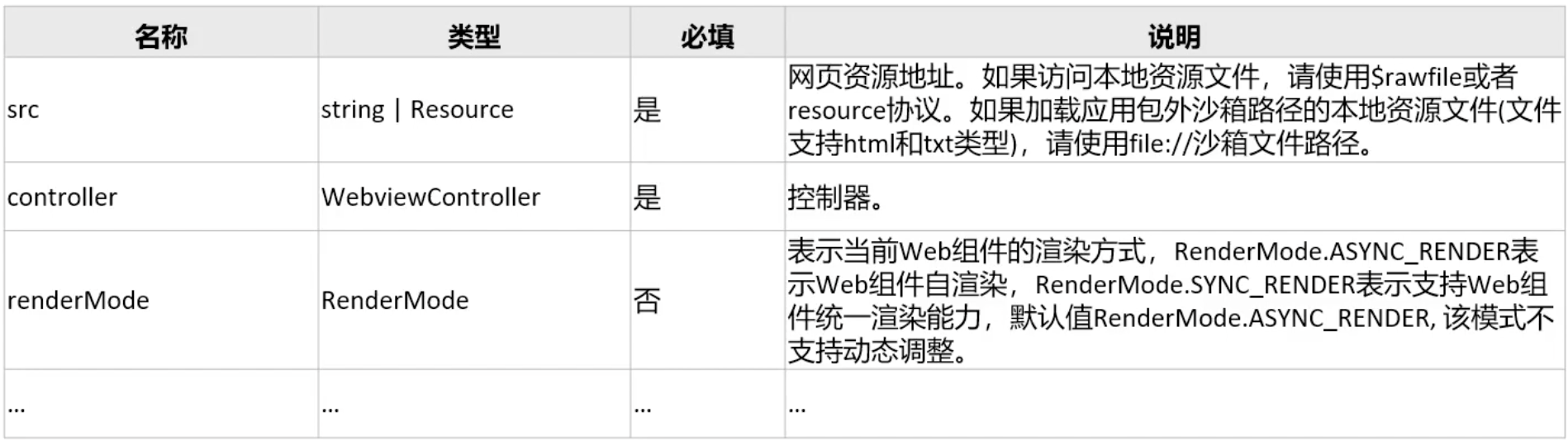 加载Web页面是Web组件的基本功能,常用的场景有加载本地页面和加载网络页面。Web页面的加载依赖Web组件接口, Web接口及参数说明如下所示。