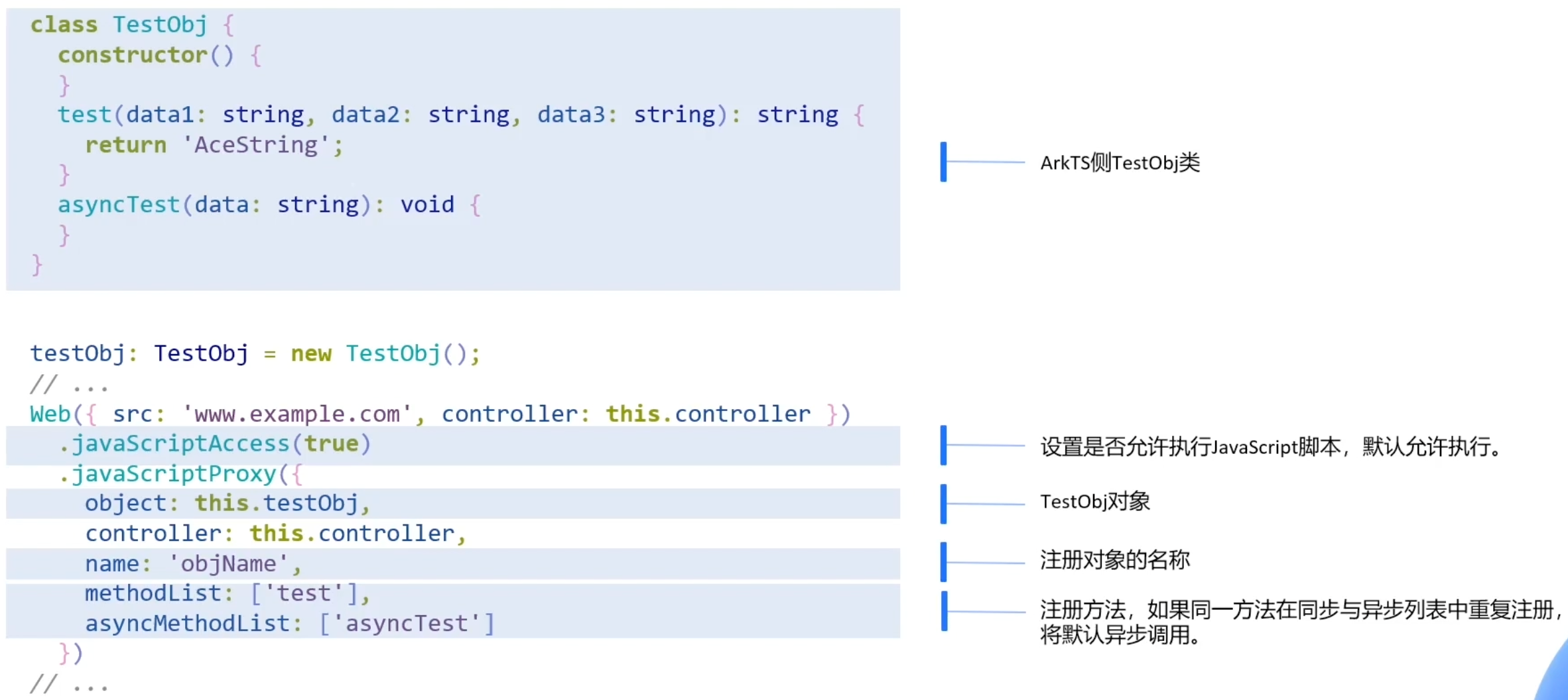在Web组件中添加javaScriptAccess属性,将javaScriptAccess设置为true。然后在Web组件中添加javaScriptProxy方法,注册JavaScript对象方法。