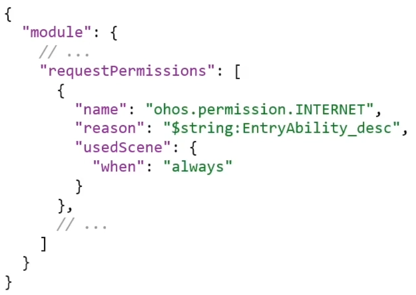 当加载网络页面时,src需要设置成对应的网络地址,同时需要在module.json5文件中添加网络权限。module.json5文件添加网络权限如下所示。